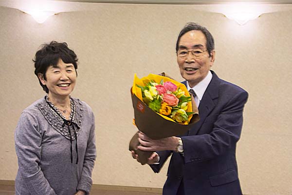 ![]() 高原(西)さんが皆を代表して先生に花束を贈呈 |