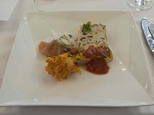 ![]() ”オードブルヴァリエ” 若鶏と茸の小さなパテ トリュフの香り キャロットラペ添え ヤングコーンと桜海老のベニエ ノルウェーサーモンスモークとアボカド |