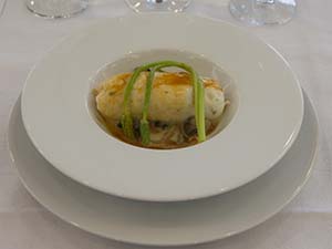 ![]() ”メインデイッシュ 魚” 白身魚と帆立貝のクネルソーセージ仕立て ほうれん草のソテー添え ブールブランソースとアメリケーヌソース |