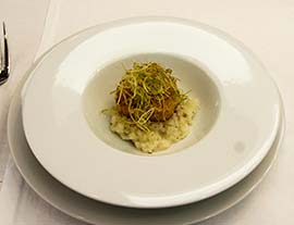 ![]() ”オードブル” 大粒帆立貝のポワレ タンドリー風 大麦のリゾットとポロ葱のフリット |