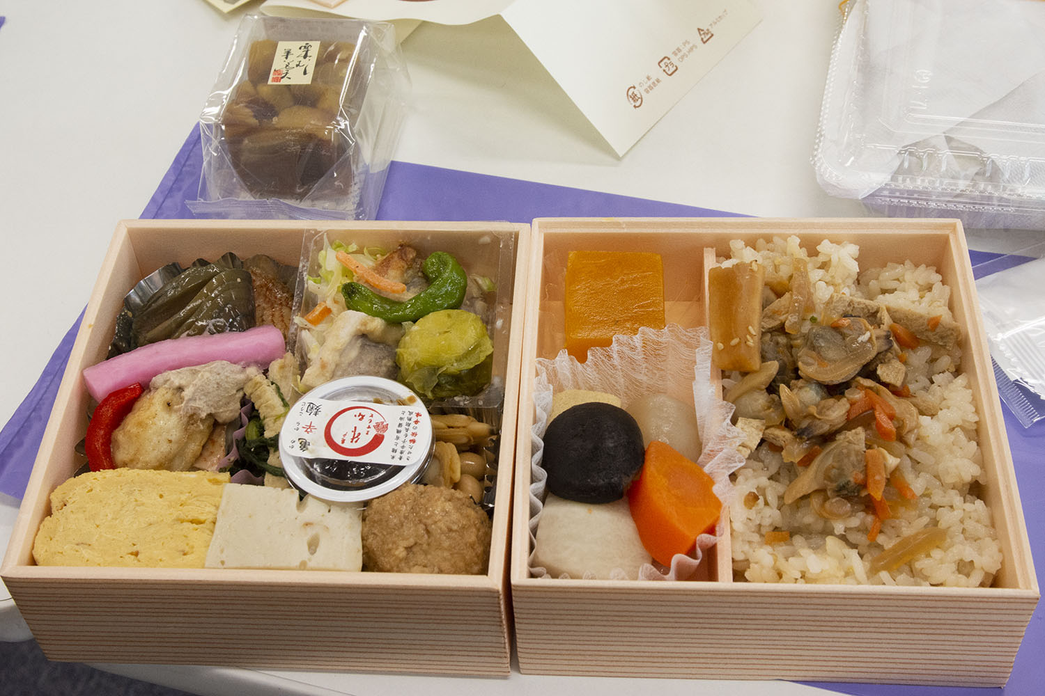 今回の食事: 「亀戸 升本」のお弁当。ご飯を少なめに、おかずを豊かに、の特別注文を受けてもらいました。 |