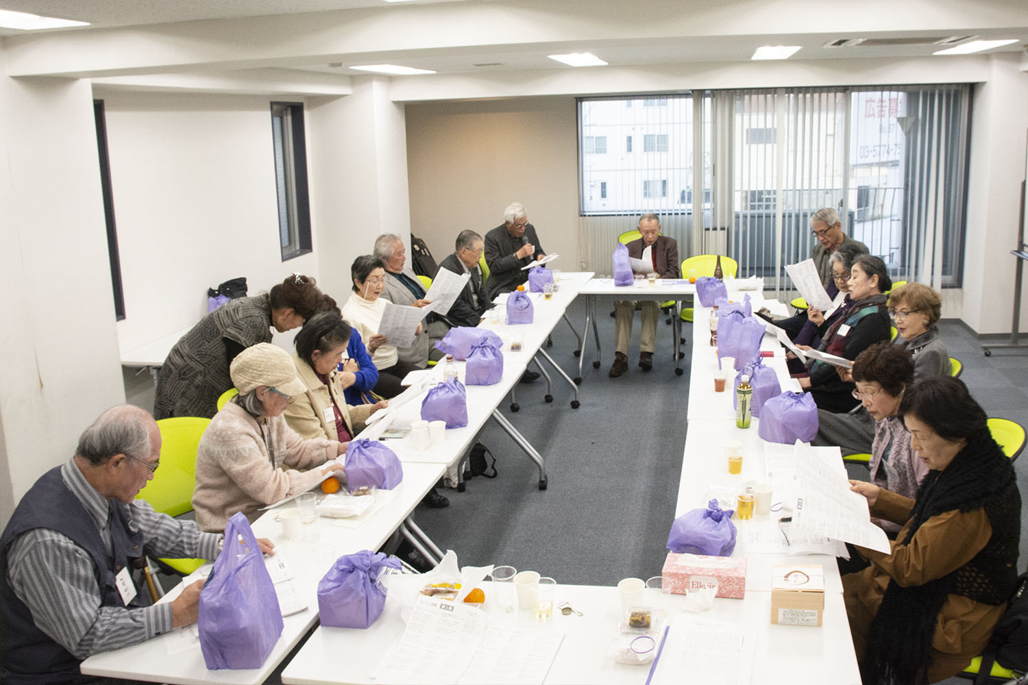 乾杯の後お弁当を食べながら、出席者全員から日頃思っていること、昔のこと、仲間への思いなど、語っていただきました。小休止をはさんで歌の時間になり、リクエストの曲目を2時間にわたって歌いました。