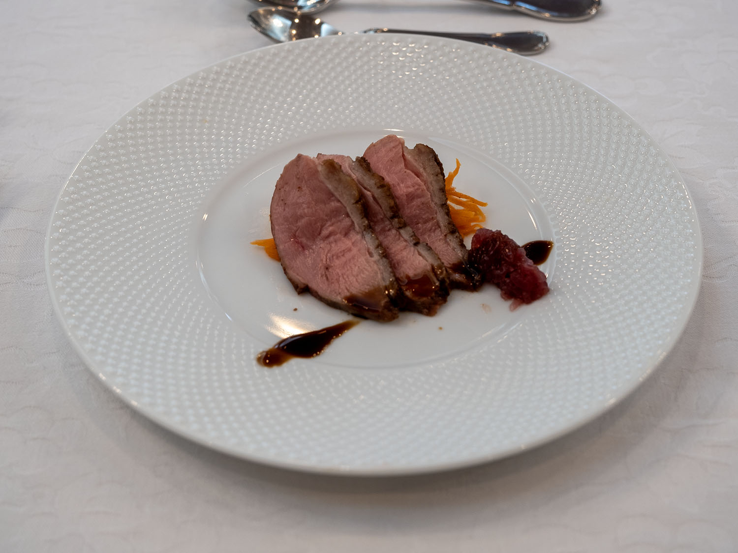 ![]() アミューゼ 鴨胸肉のアロゼ 人参のラペ添え |
