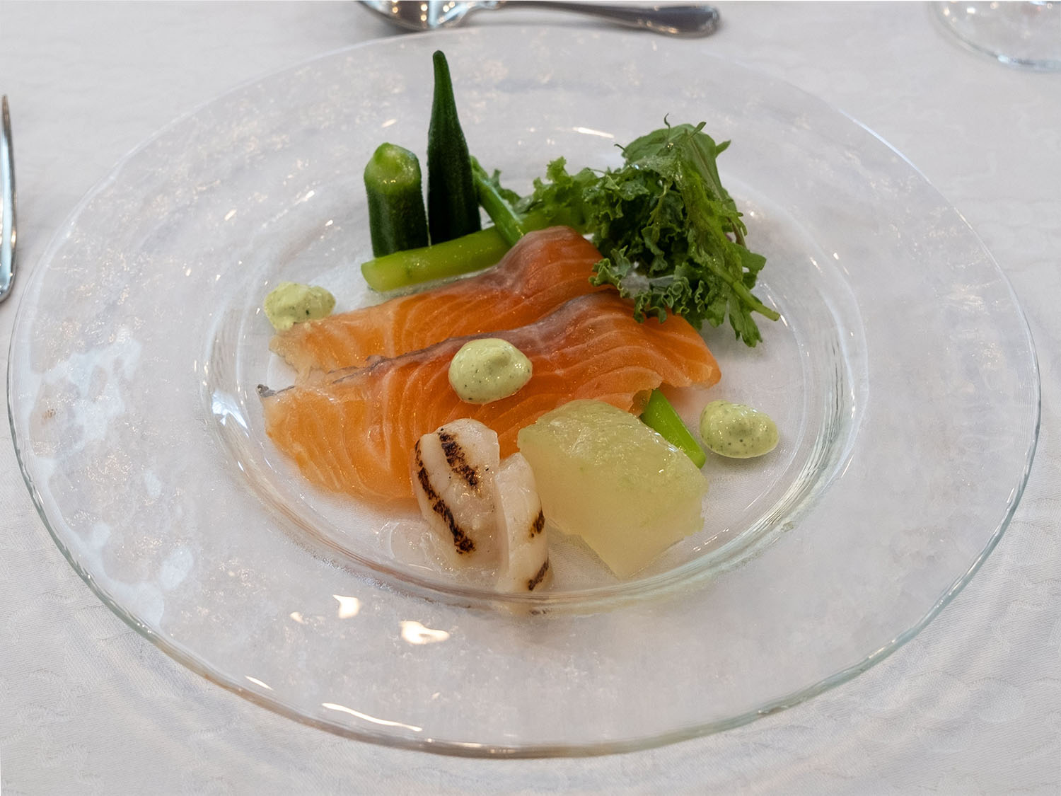 ![]() ”オードヴル” 自家製スモークサーモンと 帆立のグリルサラダ仕立て |