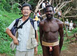 バヌアツ人はアフリカ系と蒙古系が混血したメラネシア人種で、約4千年前にインドシナ半島から島々を経由して渡来した。赤ん坊には蒙古斑があるが、成人の身体的特徴は黒い肌・縮れ毛で、精悍な体つき・顔つきの人が多く、1969年まで食人の風習があったと聞くと、思わず身構えたくなる。だが、つき合って見ると、誰もが心優しく、気の毒なほどシャイである。王様や白人に支配されて功利的になったポリネシアの人たちに比べると、バヌアツ人は純朴そのものだ。
