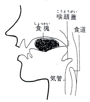 食べ物が誤って気道に入ると(誤嚥すると) → むせる・ひどいと窒息死する