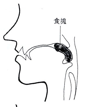 2.口腔期: 咀嚼(そしゃく)された食塊は、舌が前から後ろに向かって上あごに押し当てて行き、舌の奥へ動かされる。 |