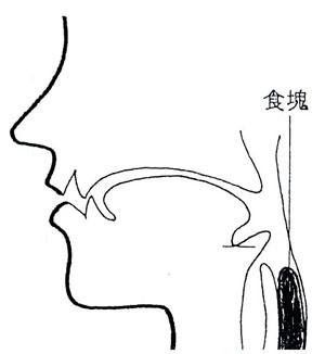 3.咽頭期: 食塊が嚥下(えんげ)反射によって咽頭に送り込まれるのは一瞬である。咽頭に送り込まれると鼻咽頭が閉じ、嚥下反射によって咽頭蓋が下がり、気道の入口をふさぐ。食塊は食道へと進む。 |