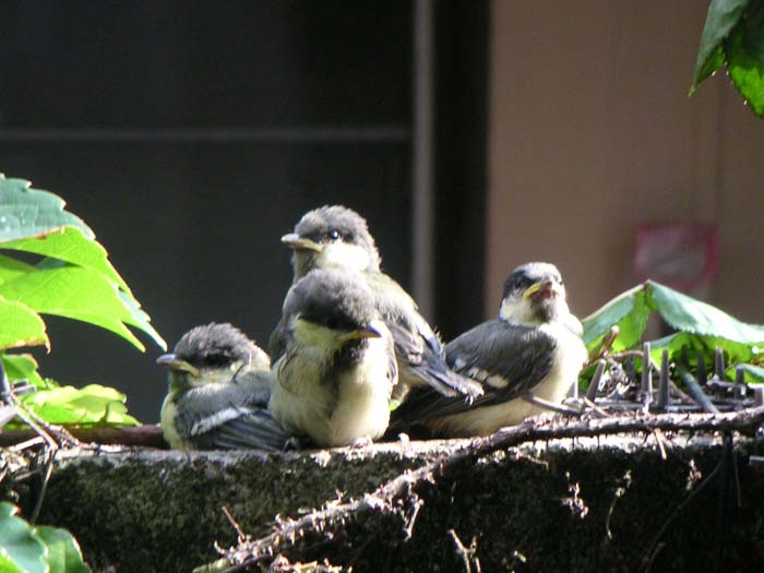 4月の初め、つがいの四十雀がしきりと巣になりそうな枯れ草などを運び、やがて巣篭もり、卵を生みつけたようだ。四月の下旬になると、チチとかすかな鳴き声が聞こえ、二羽の親鳥がしきりと餌を運ぶようになった。5月の初めになると、雛鳥の鳴き声は一段と大きくなり、親鳥が餌を運んでくるたびにチイチイと大声で啼く。親鳥も巣穴へ入る前にはあたりを警戒し、からす、猫などが近づこうものならキキとけたたましく啼く。天敵がいる間は、あたりを飛び回り、決して巣穴に入ろうとしない。私も気が気でなく、手を叩いたりして追い払うことしばしばである。この頃天敵除けに、市販の猫を避ける釘状のプラスチック器具や、とげの付いた薔薇の茎を切り、太い束に束ねて、巣穴近くを覆ってやる。不思議と薔薇の茎の束やプラスチックの器具には、巣穴近くの形状が変わっても、四十雀は警戒を示さない。