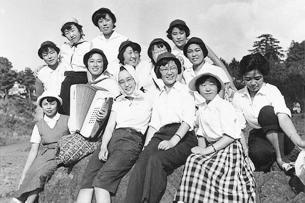 アコーディオンを持っているのがリーダーを務めたTさん。女子栄養大昭和31年卒の皆さん。